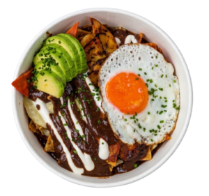 Totopos + salsa mix + huevo + ternera + aguacate + cebolla encurtida + crema + queso cheddar.