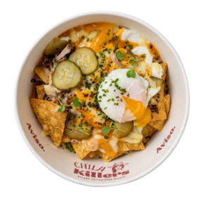 Totopos de maíz + salsa chipotle cremosa + ternera + pepinillos + cebolla crunchy + crema agria + mix de quesos.
