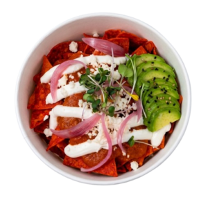 Totopos de maíz rojo crunch + salsa roja + pollo desmigado + cebolla roja encurtida + crema agria + aguacate laminado + queso fresco + cebollino fresco.